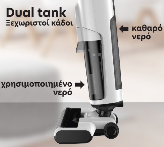 Διαθέτει σύστημα διπλού δοχείου νερού: καθαρού νερού με χωρητικότητα 700ml και δοχείο λυμάτων με χωρητικότητα 800ml. Η βάση σύνδεσης 3 σε 1 χρησιμοποιείται για την αποθήκευση αλλά και τη φόρτιση του προϊόντος. Το φίλτρο HEPA απομακρύνει τους ρύπους κατά τη λειτουργίας της σκούπας εξασφαλίζοντας ένα καθαρό περιβάλλον.